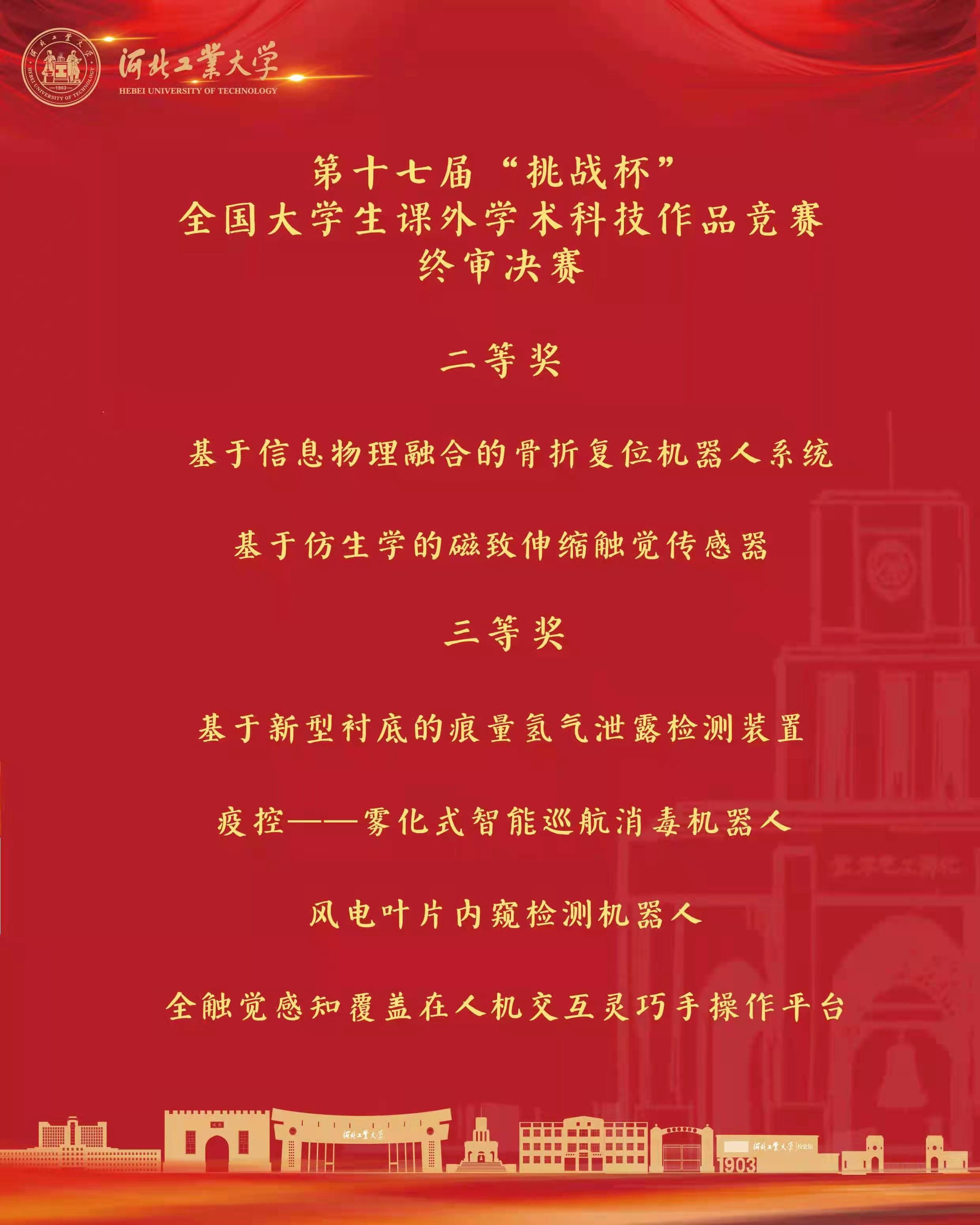 为守好安全办赛底线、彰显比赛改革实效,第十七届“挑战杯””全国大学生课外学术科技作品竞赛终审决赛于今年3月26-28日举行,采用线上方式答辩评审,我校电气学院、智能学院2支队伍晋级终审决赛答辩。回顾一年来的备赛历程,在学校领导的高度重视和大力支持下,校内相关部门、各学院协同合力,参赛团队奋力拼搏,最终取得佳绩。