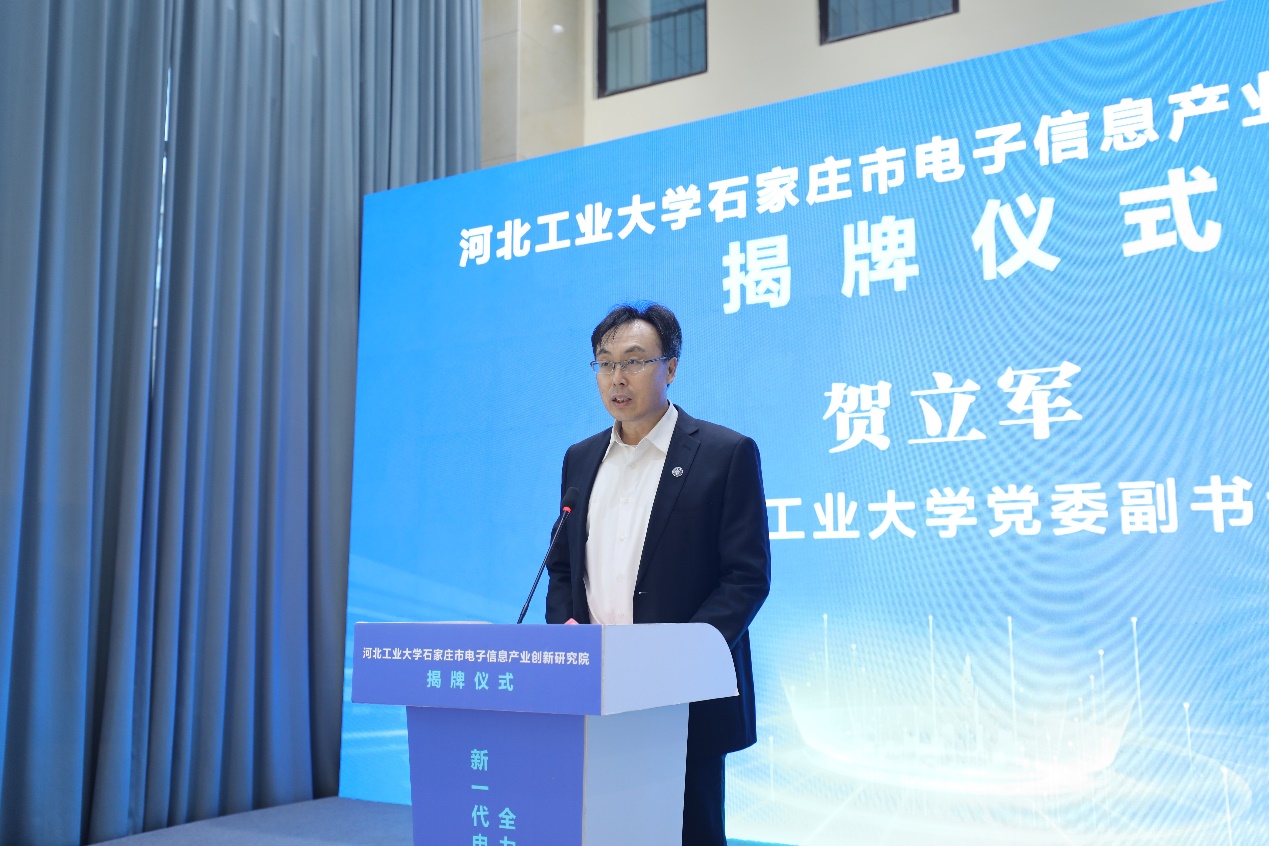 校党委副书记贺立军代表学校向石家庄市和鹿泉区对学校的信任和创新研究院成立过程中给予的帮助与支持表示衷心感谢。他表示,创新研究院是河北工业大学与石家庄市人民政府、鹿泉区人民政府为贯彻实施创新驱动发展战略,围绕区域产业特色,服务地方经济发展需求,探索新型合作路径的科技创新平台。河北工业大学倡议发起成立“河北省电子信息产业联盟”,在河北省相关政府职能部门和群团组织支持和指导下,邀请京津冀行业重点企业、科研院所以及高校参与,共同助力打造河北省新一代电子信息产业集群,实现“政产学研用”多方高水平融合协同,推动中国式现代化在河北展现出美好图景。