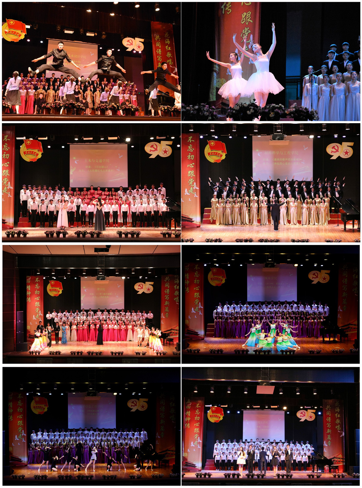 18个学院组队参赛,《长恨歌节选-渔阳鼙鼓动地来》《太阳最红毛主席最亲》《弹起我心爱的土琵琶》《他在那里站岗》等歌曲追忆岁月峥嵘,缅怀革命志士的英雄情怀;《我的祖国》《贝加尔湖畔》《堂堂正正一辈子(习主席寄语)》《一带一路尽朝晖》等激昂豪迈,唱出了新一代人奉献祖国、谱写时代新篇章的豪情壮志。振奋人心的歌曲、声情并茂的诗朗诵,配以钢琴伴奏、民族舞蹈、现场书法、芭蕾表演等多种表现形式,各合唱队用自己的歌声表达了青年对党和人民的热爱、对祖国发展未来的美好憧憬。